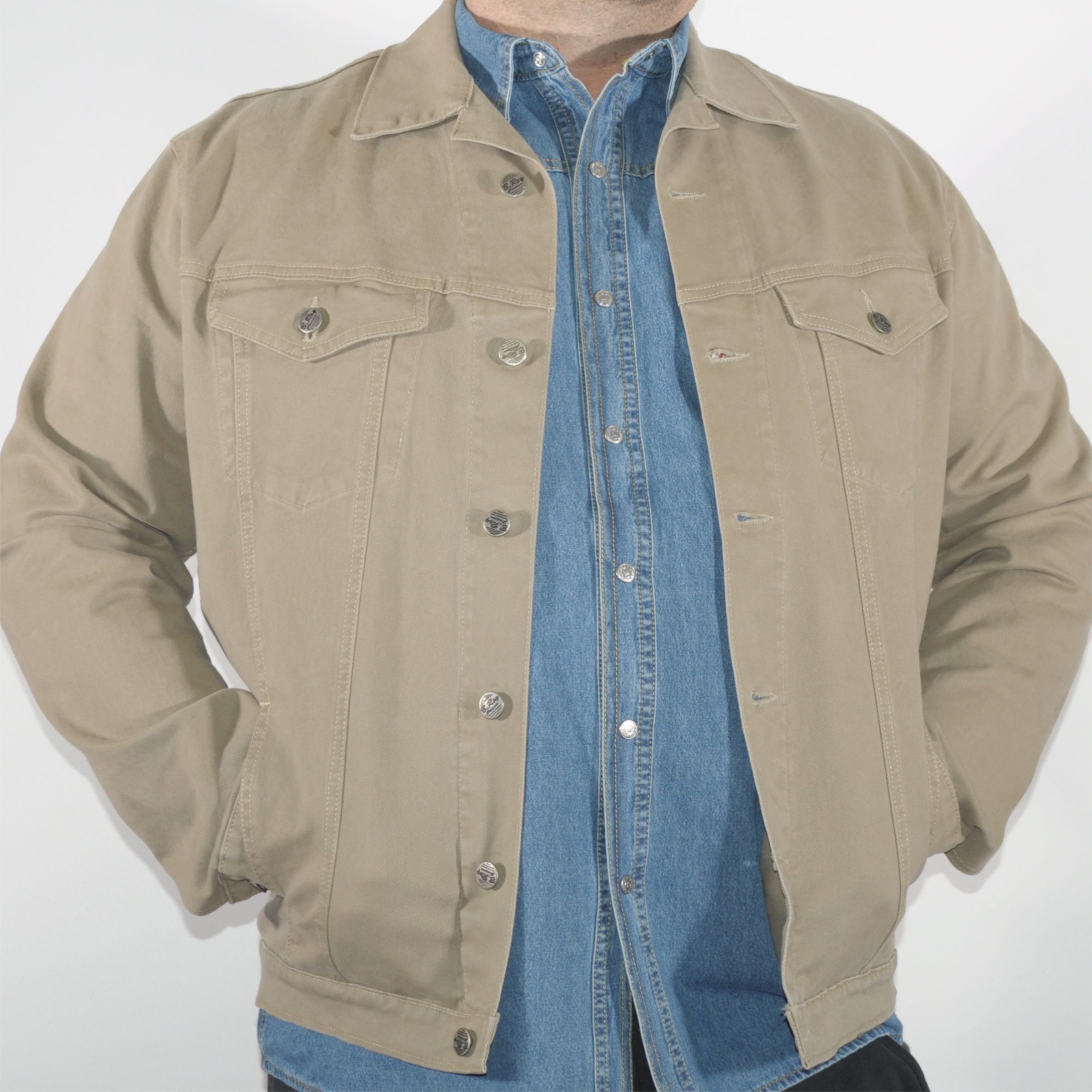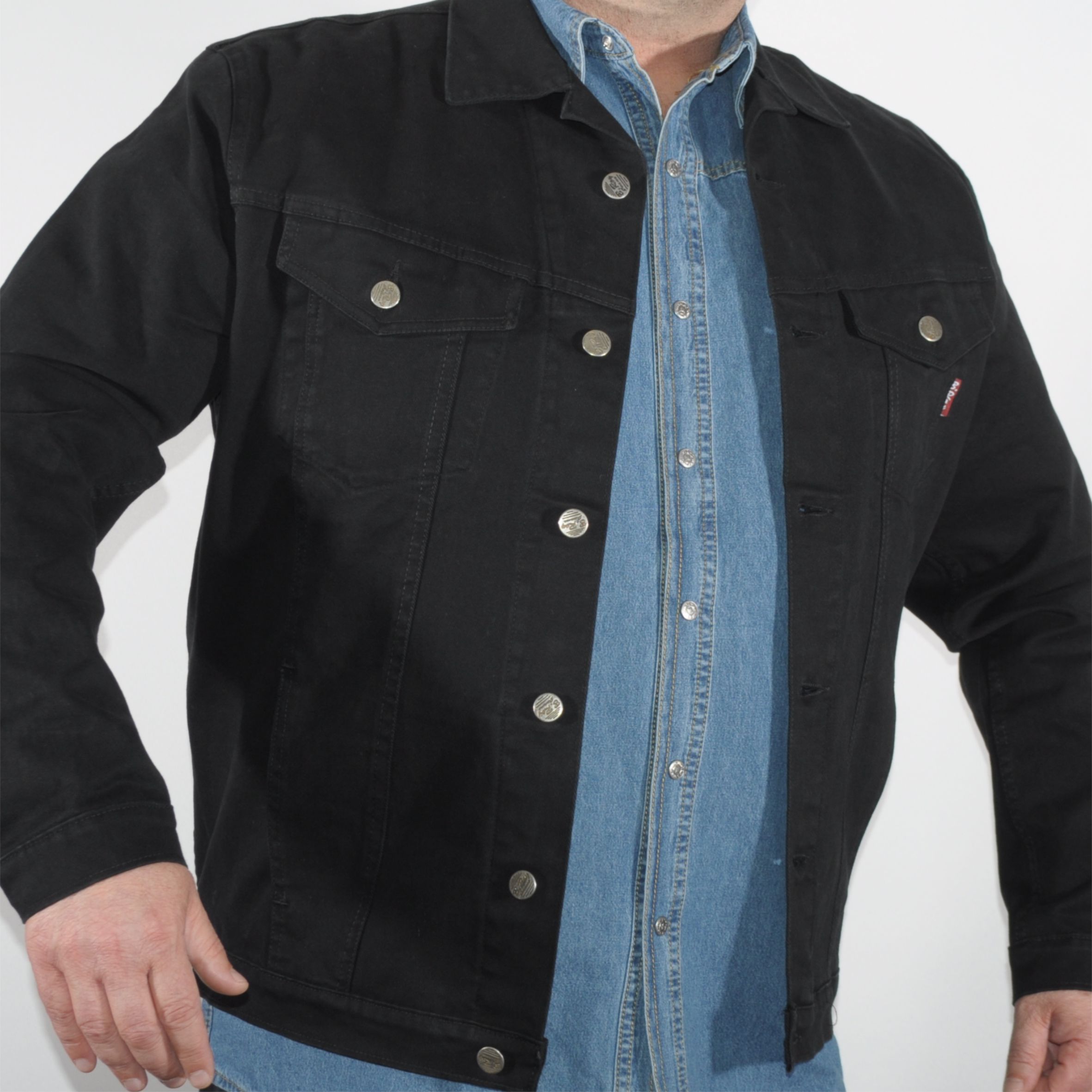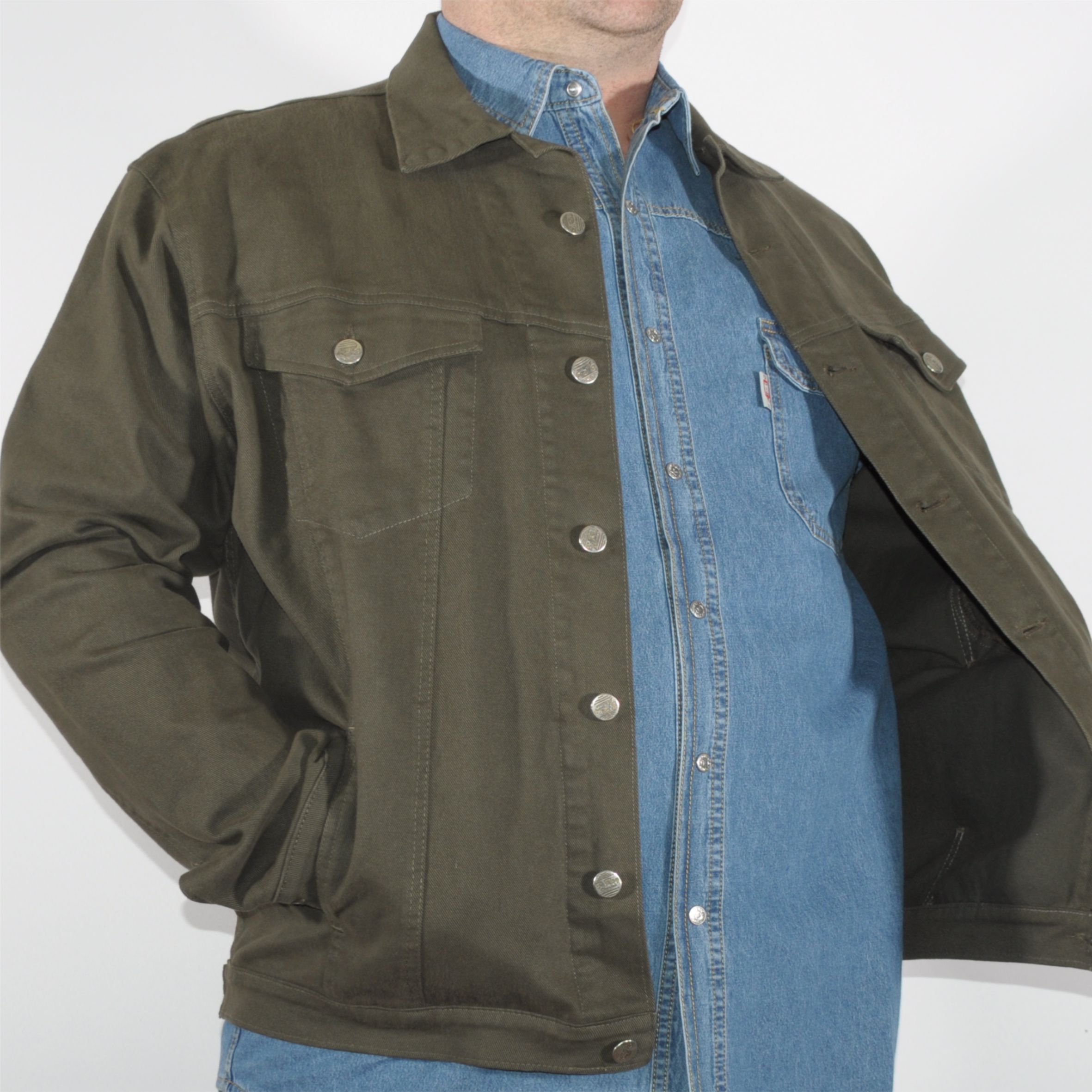 <p>Klasszikus bővített fazonú, teljesen homogén színű férfi farmerdzseki.</p>