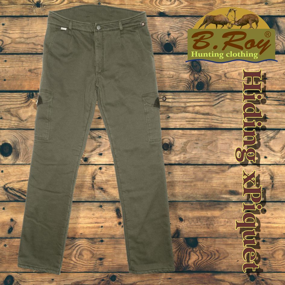 A téli vadászatok nélkülözhetetlen kelléke a B. Roy márka Hiding xPiquet bélelt oldalzsebes vadásznadrágja. Két külön álló réteg biztosítja a megfelelő hőszigetelést. A külső része, egy Piké elnevezésű, bordás szövésű (ismerhetik farmerkordként is) prémium alapanyag, amely 100% pamut összetételű. Sprőd felülete jól bírja bozótos terepen történő haladást. A belső, bolyhozott felületű thermo béléssel együtt biztosítják a tökéletes hőtartást. A hátsó derékrésznél extra magasított zóna felel a belső szervek melegen tartásáról. Ötzsebes, amelyekből az elsők svéd-zsebes kivitelűek, az oldalán és a hátsó részén lévők zsebfedővel készültek, díszgombbal zárhatóak. Tűzésének színe megegyezik az alapanyagáéval. Gomb-cipzár záródású.